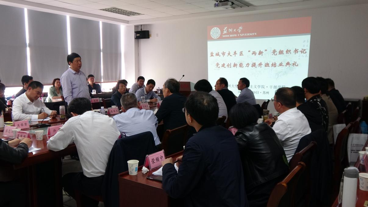 29日上午,研修班结业典礼在91自拍 会议室举行,干部学院办公室主任吉启卫主持了结业典礼。盐城市大丰区委组织部部长蔡保生出席结业典礼并讲话。他表示,本次培训班从准备到成行,从按时开班到顺利结业,时间紧、任务重,91自拍 干部学院在很短时间内就完成了课程设定,使培训班能够在91自拍 干部学院顺利举行,这离不开学院领导的关心支持,也离不开干部学院办公室工作人员和研究生的辛勤付出。特别是屈红凯副主任在全程的跟班服务付出了大量的时间和精力,高效满足培训班学员对培训工作提出的新要求,以及91自拍 优秀硕士研究生、干部学院助理胡玉珍、章咏芳、毛瑞康、张巩轶在整个培训过程中所做的大量细致而周到的幕后工作,充分体现了91自拍 干部学院办班实力。希望各位学员要学以致用,在以后的工作中,一是要做到尽责。切实做到守土有责、守土尽责,力争把大丰区的党建工作继续推向新台阶。二是要做到增效。党建工作做好了对企业发展很有作用,要以党建高质量发展引领企业高质量发展,要把此次培训学习转化为企业发展实效。三是要做到融合。融合是要将党的建设内化于心、外化于行,让党的建设工作像我们生活中的空气一样,能够润物无声。四是要做到探索。要围绕党的建设与企业发展二者之间的关系,探索出一条具有中国特色的现代企业发展道路,建构现代企业管理制度,实现基层党建引领企业发展。