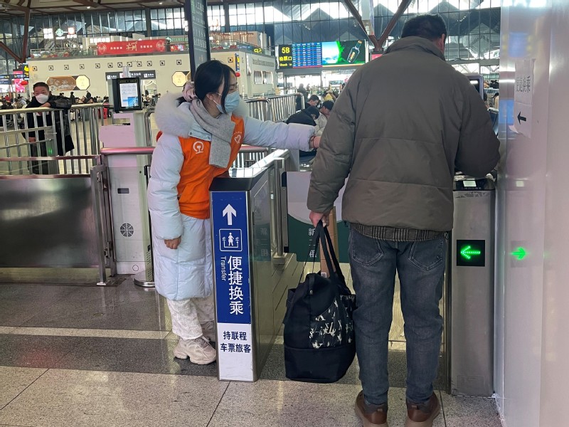图为:周宇杰参与汽车站“暖冬行动”志愿服务