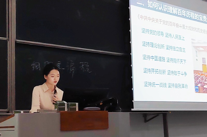 闫译允以“中国共产党百年历程的宝贵经验”为主要内容进行授课。闫老师充分利用教学资源,精心设计教学方案,在课程导入、理论解读、案例分析、课堂管理等方面,展示了扎实的理论功底和较强的授课组织能力,达到了预期的教学效果。
