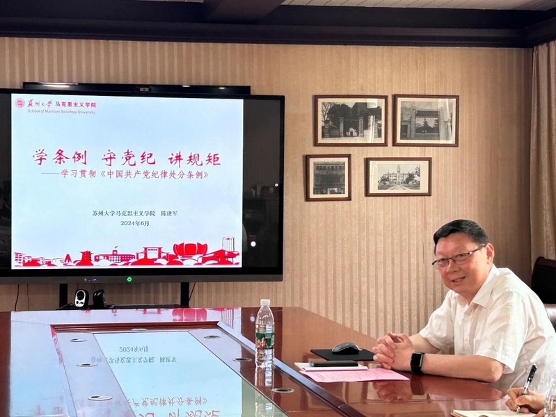 随后,陈建军以“学条例 守党纪 讲规矩”为主题,围绕新修订的《中国共产党纪律处分条例》进行本期培训班第一课授课。课上,陈建军介绍了开展党纪学习教育的背景和要求,阐释了此次《条例》修订的重要意义以及主旨要义,明确贯彻执行《条例》的基本要求。为了能更深入地开展纪律教育,他希望培训班学员能够原原本本、逐章逐条学习新修订的《条例》,自觉用党员标准和党的纪律规范言行,强化纪律意识、加强自我约束。