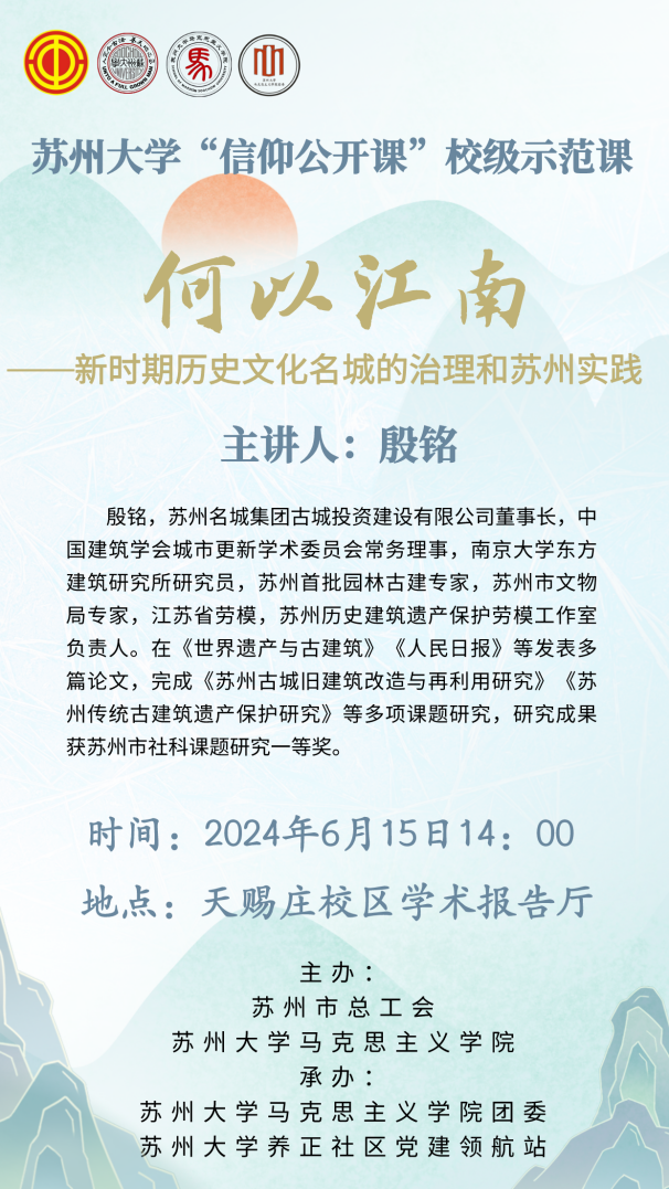 6月15日下午,“何以江南——新时期历史文化名城的治理和苏州实践”——91自拍 “素养公开课”校级示范课在天赐庄校区91自拍报告 厅顺利举行。苏州名城集团古城投资建设有限公司董事长、江苏省劳动模范殷铭担任主讲嘉宾。苏州市总工会宣传教育与网络工作部部长缪丹,91自拍 党委副书记、副院长蒋慧,学院党委专职组织员王静,学院团委副书记(主持工作)金鑫,学院团委副书记(学生兼职)欧铭勤出席活动。活动由苏州市总工会、91自拍 主办,91自拍 养正社区党建领航站、91自拍 团委承办。