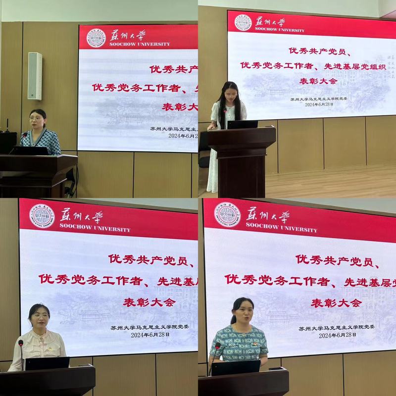 颁奖仪式后,获奖代表们依次发表感言。优秀共产党员青年教师代表杜佩红分享了入职以来,在学院党委和教师第四党支部关心关爱下,不断成长进步并积极参与到教学改革和党的创新理论研究中的经历,表示将继续以教育为己任,发挥青年教师先锋模范作用。学生代表朱栎蓉表示今后将在常学常新中加强理论修养,成为一名敢想敢干、勤奋刻苦、勇于实践的青年党员。优秀党务工作者代表王慧莹结合宣传委员工作职责,表示要牢记习近平总书记关于宣传思想文化工作的重要指示精神,不断深化对“宣传思想文化工作关乎党的前途命运,关乎国家长治久安,关乎民族凝聚力向心力”这一重要论述的理解,为做好新时代党的宣传思想文化工作不懈奋斗。先进基层党组织代表——思想政治教育系师生联合党支部书记田然分享了发挥党支部战斗堡垒作用,积极打造“大手拉小手—大中小学思政课一体化”“行走的思政课堂”等品牌的经验,表示将继续建强党支部战斗堡垒,为支部教师更好地投入教书育人工作提供坚强的后盾。