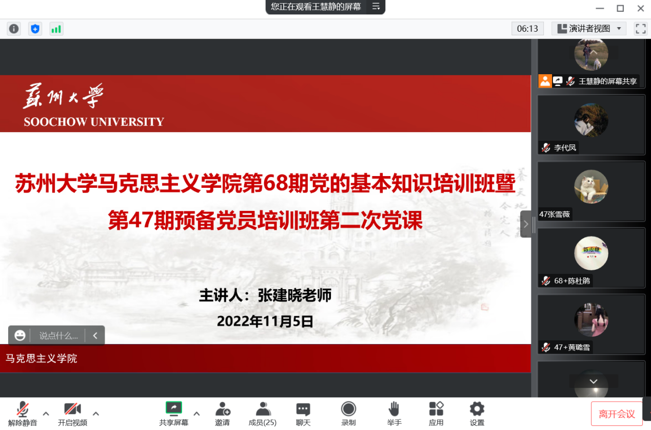 11月5日,91自拍 第68期党的基本知识培训班暨第47期预备党员培训班第二次党课顺利开展。91自拍 张建晓老师受邀围绕学习党的二十大精神讲授主题党课,第68期党的基本知识培训班、第47期预备党员培训班学员参加了此次活动。活动由2021级硕士研究生王慧静主持。