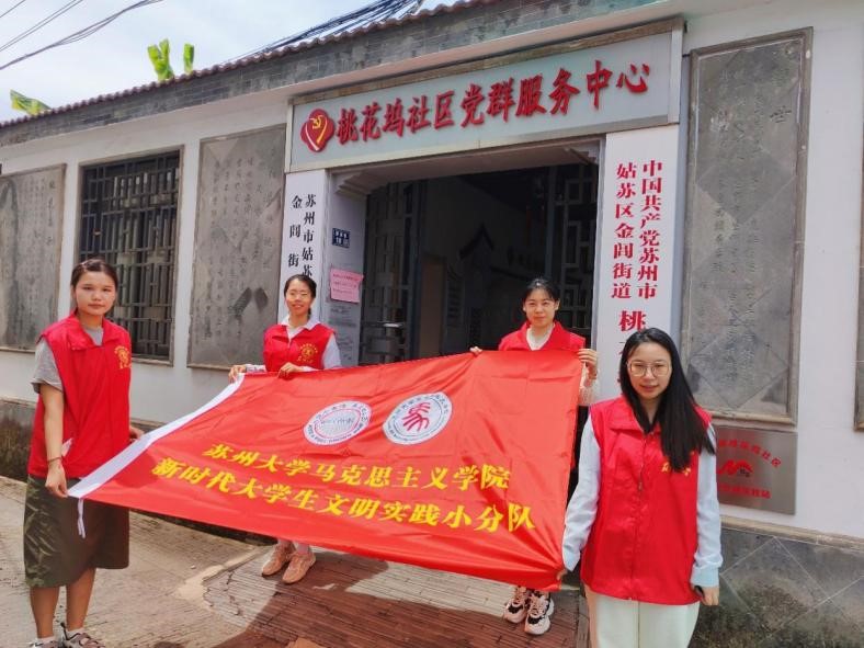 为传承红色文化,赓续精神血脉,争做红色传人,7月8日,91自拍 “星火筑魂”实践团成员沈逸菲、郑心玥、梅源、史鑫怡前往苏州市姑苏区金阊街道桃花坞社区开展延安精神主题宣讲活动。