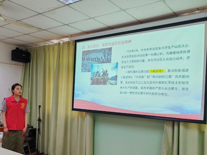 团队成员沈逸菲围绕延安精神的基本内涵和当代价值为桃花坞社区居民进行理论宣讲。她着重讲述了延安时期革命先辈克服极端困难条件,坚持艰苦卓绝斗争的光辉历程。这些光辉事迹折射出革命先辈忠贞不渝的政治品格、百折不挠的意志品质和无私奉献的高尚情操。