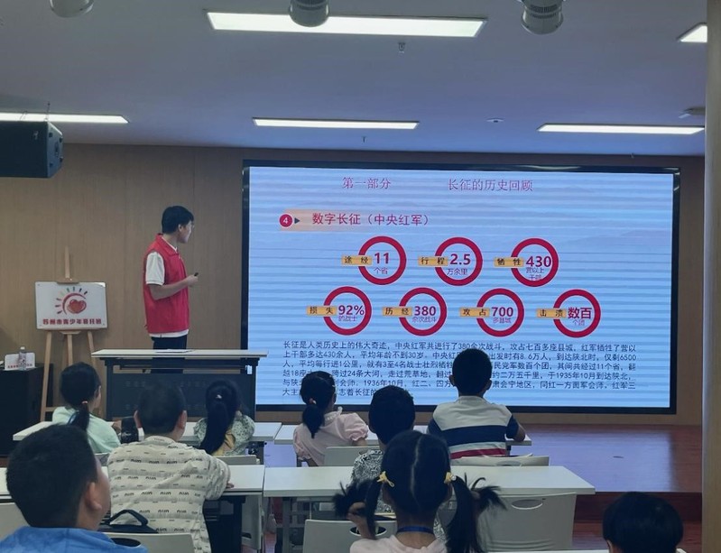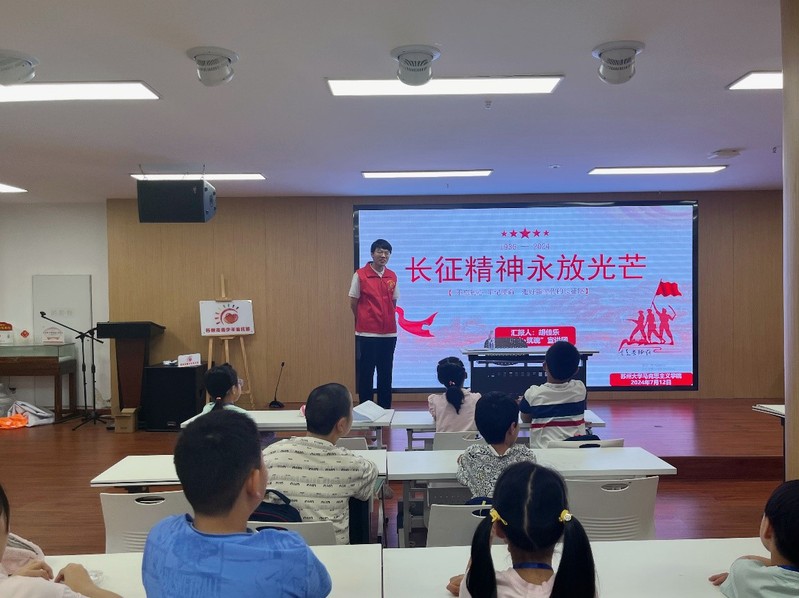 团队成员胡佳乐以《七律·长征》导入,以“长征的历史回顾、著名历史事件、长征精神的意义、领导人话长征、走好新时代长征路”为发展脉络进行讲解。他采用了青少年喜闻乐见的动画形式,生动再现了革命战争的艰苦岁月,将教育性和趣味性相结合,让学生们潜移默化地接受红色文化的熏陶,让长征精神在心中生根发芽。