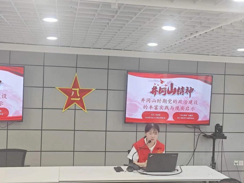 团队成员包诗琪围绕党在井冈山时期的政治建设的理论基础、丰富实践以及现实启示三个方面进行宣讲。她以井冈山时期中国共产党面临的重重挑战为切入点,详细论述了井冈山时期中国共产党政治建设的伟大实践。“山沟沟里的马克思主义”证明,只有将马克思主义基本原理与中国革命具体实际相结合,始终坚持党的领导,才能切实做到以政治建设为统领,把党建设的更加坚强有力。
