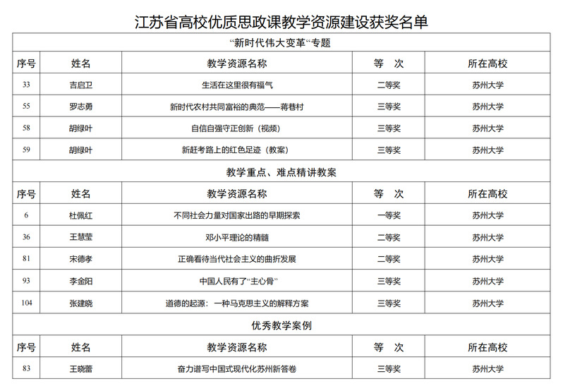 近日,江苏省高校思政课教学指导委员会公布了省高校优质思政课教学资源建设获奖名单,91自拍 杜佩红、宋德孝、王慧莹、吉启卫、王晓蕾、罗志勇、胡绿叶、李金阳、张建晓老师斩获一等奖1项、二等奖3项、三等奖6项,获奖数在全省名列前茅。