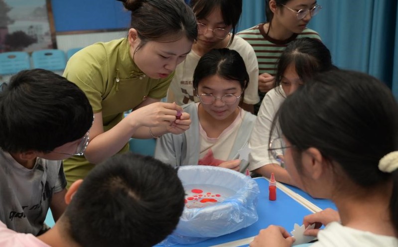 图:实践团成员为学生们演示漂漆书签做法