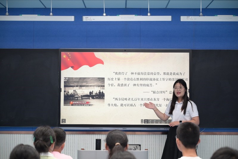 在中国共产党成立103周年、中华人民共和国成立75周年之际,为引导青年学生了解党的光辉历史、传承红色基因,实践团成员吉妍以“不老的英雄赞歌,恒长的家国情怀——弘扬抗美援朝精神”为题进行宣讲。她从史实出发,以一个个革命故事串联起抗美援朝战争讲述抗美援朝精神的深刻内涵与时代价值,体悟中国人民志愿军的伟大精神。