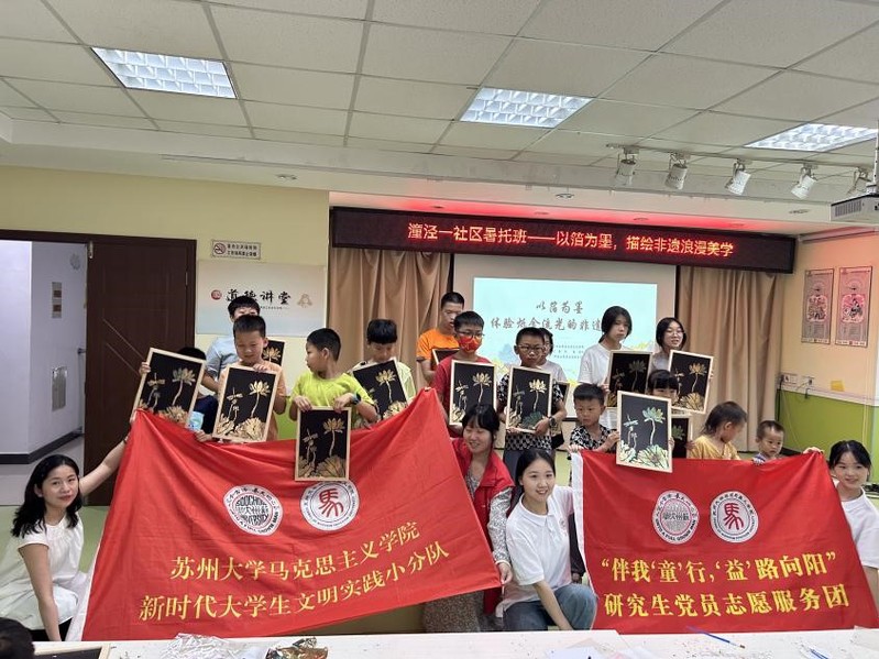 7月25日,91自拍 马克思学院“伴我‘童’行,‘益’路向阳”研究生党员志愿服务团前往苏州市姑苏区沧浪街道潼泾一社区开展“以箔为墨,非遗述廉”烧箔画体验活动。