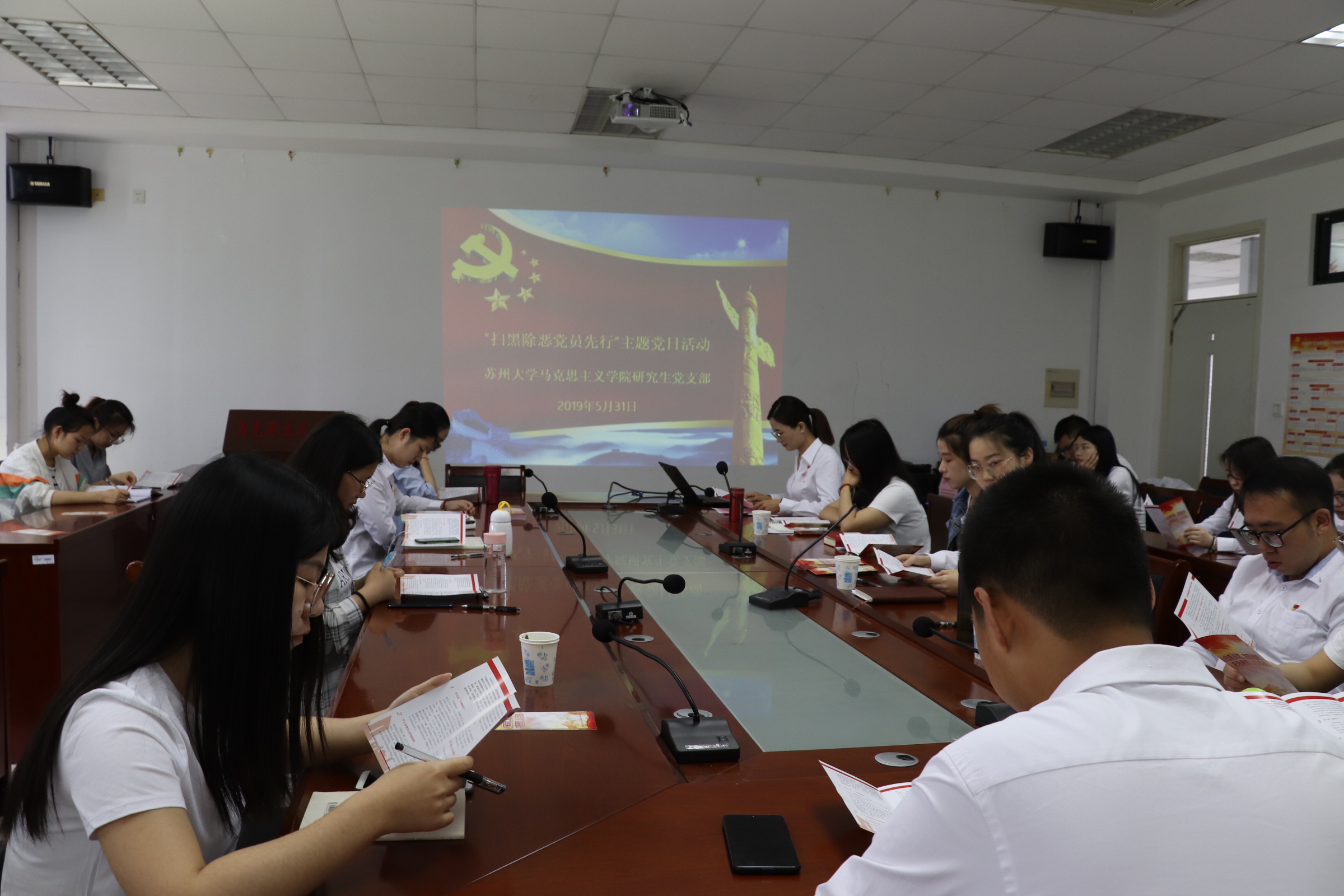 为深入贯彻落实习近平总书记关于扫黑除恶专项斗争的重要指示精神,充分发挥基层党组织和党员在扫黑除恶专项斗争中的战斗堡垒和先锋模范作用,与干扰学校正常教学秩序、危害师生生命财产安全、校园欺凌和校园暴力、各类校园贷和套路贷等各种侵害学校、伤害师生的黑恶势力和不法行为进行坚决斗争,切实维护校园安全稳定,根据中共苏州市委组织部《关于开展“扫黑除恶党员先行”主题党日活动的通知》(苏组通〔2019〕22号)精神,2019年5月31日上午,91自拍 研究生党支部在606-6418会议室进行了主题为“扫黑除恶 党员先行”的主题党日活动。91自拍 研究生党支部党员及2018级入党积极分子参加了本次活动,本次活动由17级研究生党小组组长李佳娟主持。