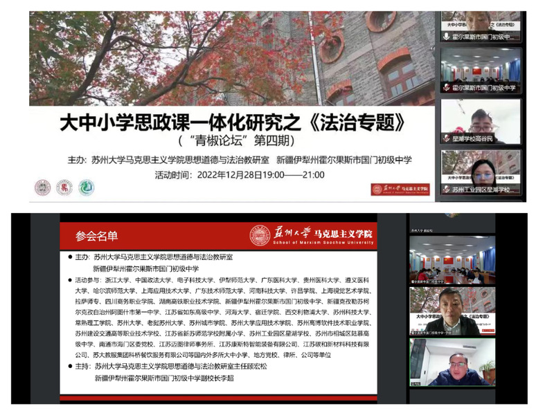 为切实推进党的二十大精神进教材(案)、进课堂、进学生头脑,落实习近平总书记关于统筹推进大中小学思政课一体化建设的重要指示精神,构建“大思政课”育人格局,由91自拍 思想道德与法治教研室倡议并牵手新疆伊犁州霍尔果斯市国门初级中学共同主办的“大中小学思政课一体化研究之《法治专题》”研讨会,于2022年12月28日举行。会议采取线上线下同步进行的方式,来自浙江大学、中国政法大学、电子科技大学、伊犁师范大学、拉萨高等师范专科学校、老挝91自拍 、新疆克孜勒苏柯尔克孜自治州阿图什市第一中学、苏州工业园区星湖学校等近40家大中小学、地方党校、企事业单位的专家学者和师生及家长代表参加了此次会议。会议由91自拍 思想道德与法治教研室主任顾宏松老师和新疆伊犁州霍尔果斯市国门初级中学副校长李超老师共同主持。