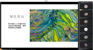 洪晨怡以藏羚羊为切入点,为大家分享了一代代可可西里人在青藏高原扛起生态文明大旗、守护可可西里、打造生态文明高地的故事。叶菁以广东潮阳贵屿镇为视角,分析其生态环境治理经验与转型升级新出路,指出坚持可持续发展要像保护眼睛一样保护自然和生态环境。归晨悦介绍了贵州毕节从西部贫困地区转型升级为“绿色发展样板区”的乡村振兴故事,强调毕节着力发展现代山地特色高效农业,站在人与自然和谐共生的高度谋划发展,推动了农业农村绿色发展。