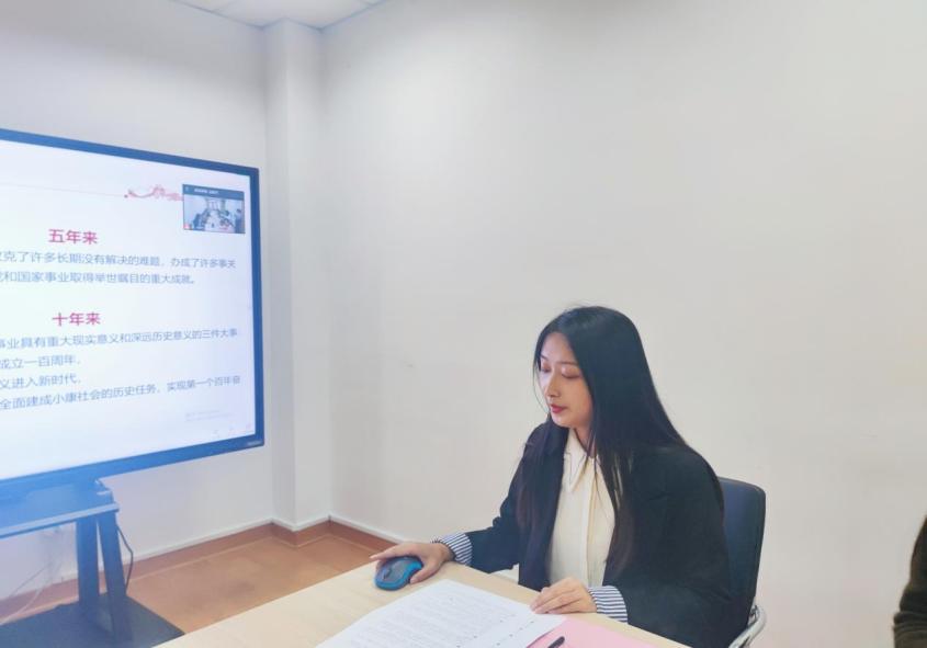 宣讲团成员代表韩心怡以“奋进新征程 担当新使命——学深悟透党的二十大精神”为题进行试讲,她从大会基本概况、大会主题介绍、报告内容解读、青年使命担当四个方面展开。在对党的二十大精神进行系统科学阐述后,韩心怡同学就青年使命担当作出了自己的理解与解读。她号召广大青年要常怀忠心、厚植初心、淬炼信心、永葆决心,从理论学习中筑牢信仰,在实际运用中彰显信仰。