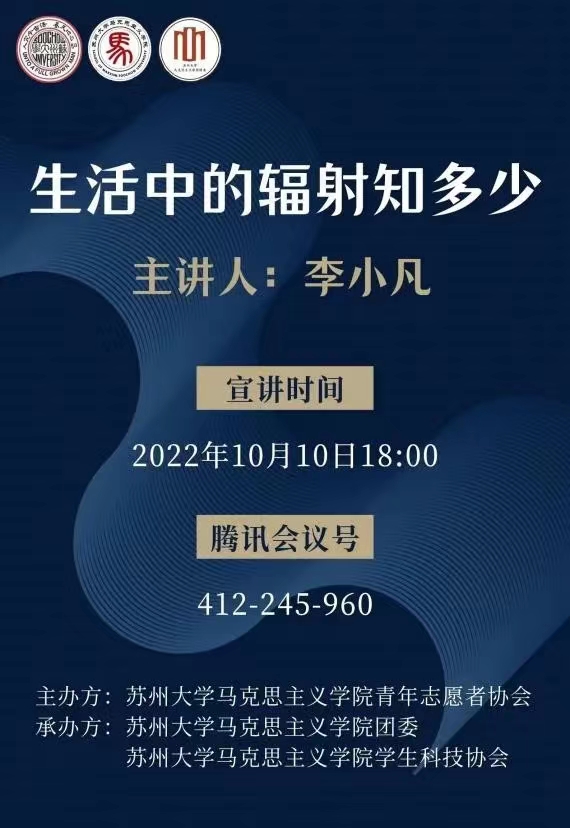 青年志愿者协会宣讲团顺利开展“强国有我‘核’你一起”大学生志愿宣讲活动,本期宣讲主题为“生活中的辐射知多少”。活动由学院青年志愿者协会主办,学院团委、学生科技协会承办。活动由2021级硕士研究生王林宇主持。