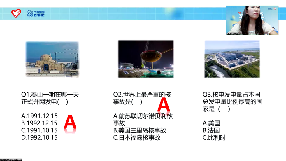 主讲人王林宇在核知识科普宣讲中还穿插了紧张刺激的竞答环节,抢答题目均围绕着世界与中国的核技术发展开展,与会同学们参与热情高涨,互动学习氛围浓厚。竞答环节的设置加深了同学们对于核技术知识的学习和巩固,在一定程度上激发了大家对中国核工业发展事迹的兴趣与关注。