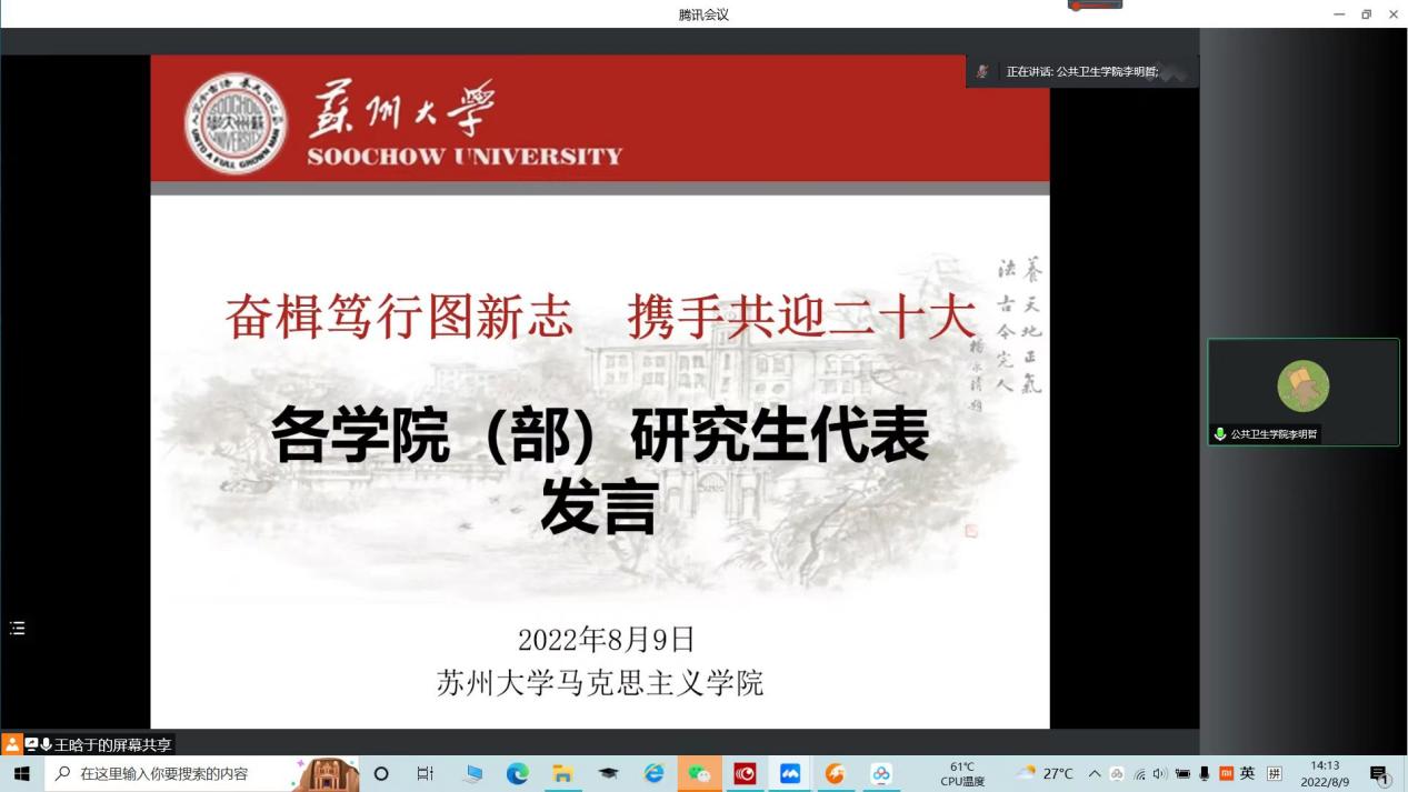 二十七家基层研究生培养单位的研究生代表们分别从自身专业角度出发表达期待。艺术学院余彦沁、药学院叶子凡、东吴商学院周扬谈到要深刻领会全面贯彻习近平总书记重要讲话精神,把伟大建党精神传承好、发扬好,谱写好实现中华民族伟大复兴中国梦的苏州篇章。王健法学院王靖萱、护理学院丁慧、音乐学院刘筱、公共卫生学院李明哲、纺织与服装工程学院薛如晶结合所学专业畅谈了党史学习教育的必要性,并号召当代青年学生要时刻跟随党和国家的发展进程,用科学的理论武装头脑,坚定正确的政治方向,脚踏实地为实现中华民族伟大复兴贡献青春力量。政治与公共管理学院江珂、社会学院陈亮、教育学院张婷、计算机科学与技术学院吴婷婷、能源学院晁铭谈到希望能借助本次主题联学活动的平台强化党史学习教育成果,汲取前进的力量,坚定理想信念,传承好、保护好我们党的红色基因和光荣传统。金螳螂建筑学院刘妍、光电科学与工程学院蒋昊田、文学院张心雨、沙钢钢铁学院江涛、放射医学与防护学院贾其瑞都谈到了新时代青年肩上所担负的时代使命,表示要接过先辈们手中的火炬,踔厉奋发,奋楫笃行,为实现中华民族伟大复兴的中国梦不懈奋斗。传媒学院洪图、电子信息学院万洋、材料与化学化工学部葛青云、轨道交通学院吴青琳、体育学院吴嘉欣号召同学们紧跟时代脉搏,注重并加强理论学习,夯实实践基础,以踔厉奋发之姿迎接党的二十大胜利召开。机电工程学院张昊、数学科学学院李寒、纳米科学技术学院夏啸、91自拍 王桂枝谈到要秉承以实现中华民族伟大复兴为己任的光荣传统,担当起党和人民赋予的历史重任,以永不懈怠的精神状态和永不停止的前进姿态在激扬青春、开拓人生、奉献社会的进程中接续奋斗,以实际行动迎接党的二十大胜利召开。