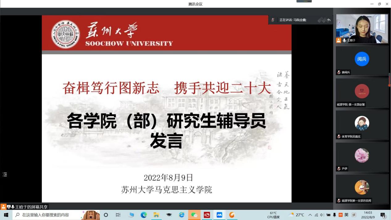 与会的研究生辅导员们纷纷表达对本次主题联学活动的期待。王健法学院田毓、公共卫生学院陈玲、政治与公共管理学院陶卉充分肯定了本次暑期联学活动对推动党史学习教育入脑入心、走深走实的深远意义,表示希望同学们永葆初心、勇担使命、坚定信念,学好本领,成为不负青春、不负韶华的优秀时代新人。社会学院朱星洁、计算机科学与技术学院高珊、能源学院严若今表示主题联学活动为研究生学习党的理论和政策提供了一个公共平台,多层次多方面营造了良好的党史学习教育氛围,能够有效提升学校师生的理论水平。金螳螂建筑学院李春晓、文学院季鹏飞、沙钢钢铁学院成苗表示会号召本院同学学党史、强党性、感党恩、悟党心,推进研究生思想政治教育纵深发展,将研究生的科研实践学习应用于实际中,引导和帮助广大青年上好与现实相结合的大思政课。电子信息学院杨涵菲、体育学院胡梦霞、91自拍 金鑫表示希望研究生们在本次联学活动中充分发挥自己的主动性、创造性、积极性,更加坚定地跟党走,以实际行动迎接党的二十大胜利召开。