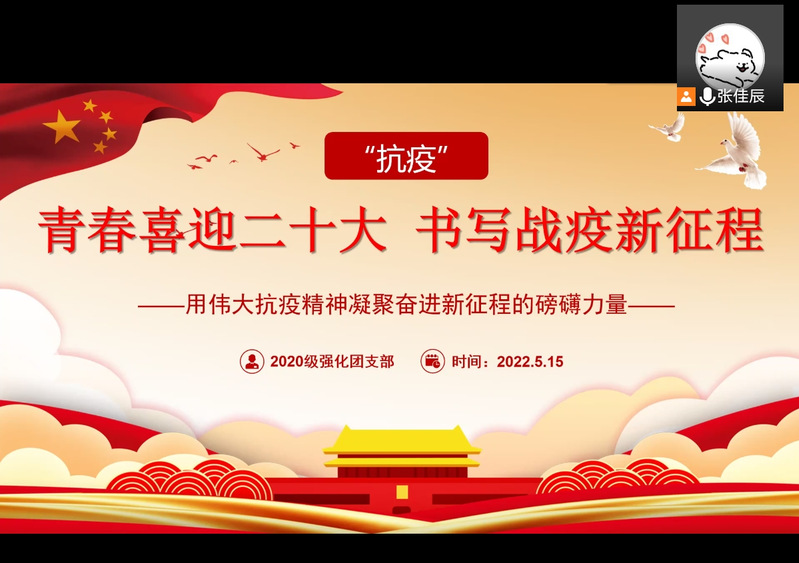 材料与化学化工学部张佳辰以“青春喜迎党的二十大 书写战疫新征程——用伟大抗疫精神凝聚奋进新征程的磅礴力量”为主题进行宣讲。他从三个维度讲述了伟大抗疫精神产生的原因、深刻内涵及当代价值,号召大家向疫情防控工作中涌现出来的先进组织和优秀志愿者学习。最后,张佳辰在总结发言中指出,广大青年学子一定要大力弘扬伟大抗疫精神,以坚定的理想信念和不懈的奋斗姿态,让抗疫精神永放时代光芒,凝聚成实现中华民族伟大复兴的磅礴力量。