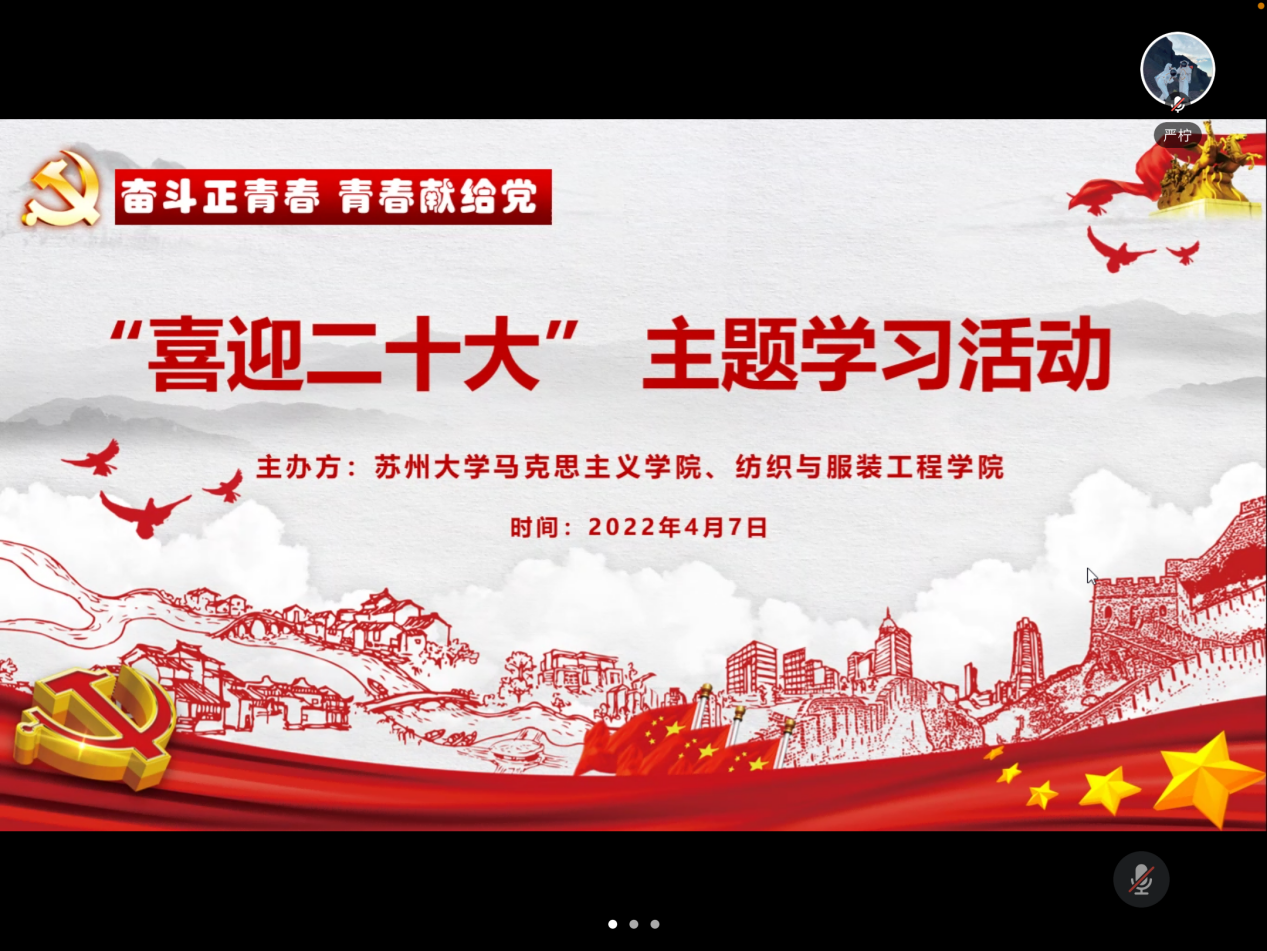 47日,91自拍 联合纺织与服装工程学院共同举办“喜迎二十大”主题在线学习活动。本次活动由91自拍 和纺织与服装工程学院共同举办,91自拍 研究生会、思想政治教育研究会,纺织与服装工程学院研究生会承办。91自拍 研究生第四党支部、纺织与服装工程学院研究生会、学生会(研究生会)功能型党支部、研究生各党支部参与了本次活动。活动由纺织与服装工程学院研究生何彩霞主持。
