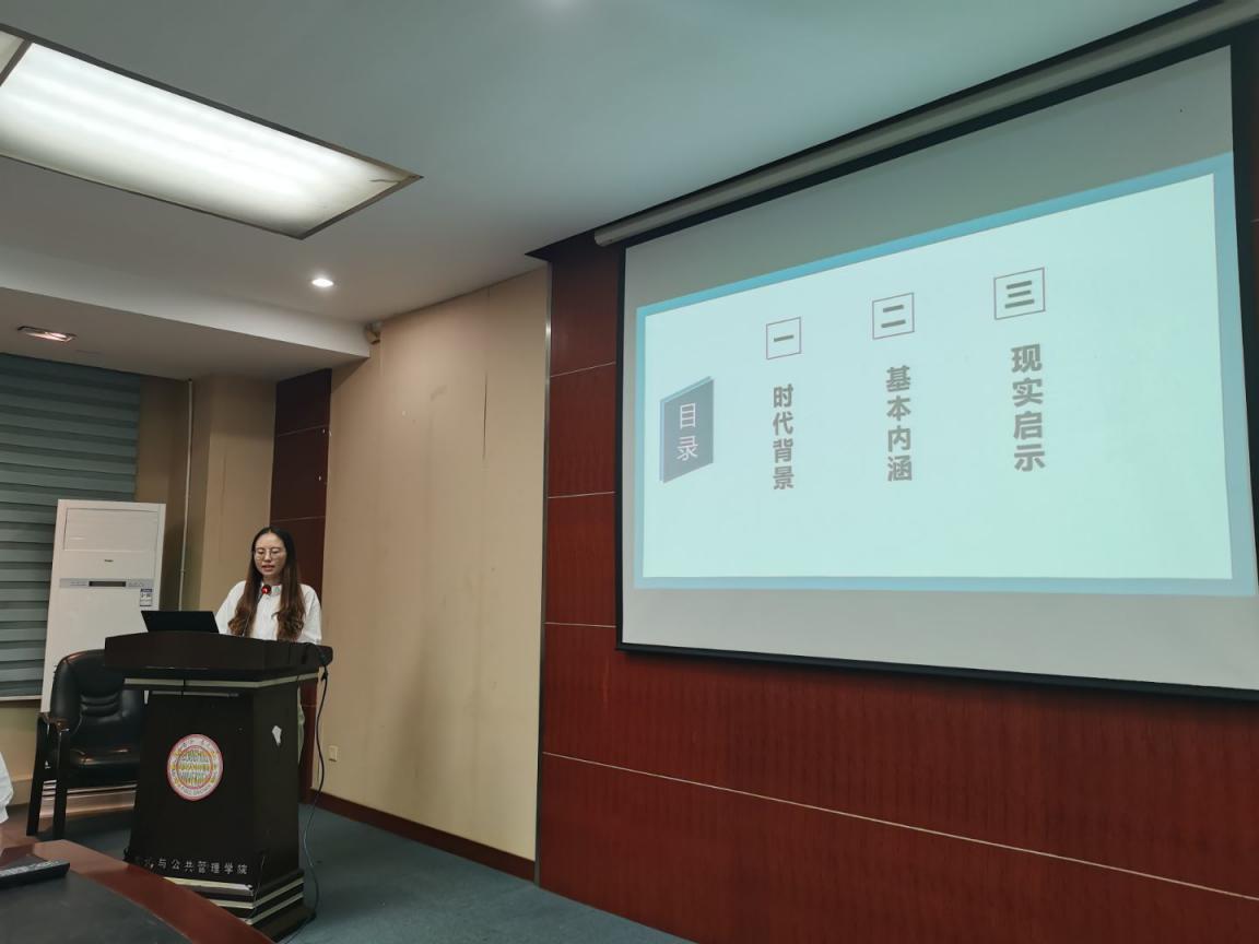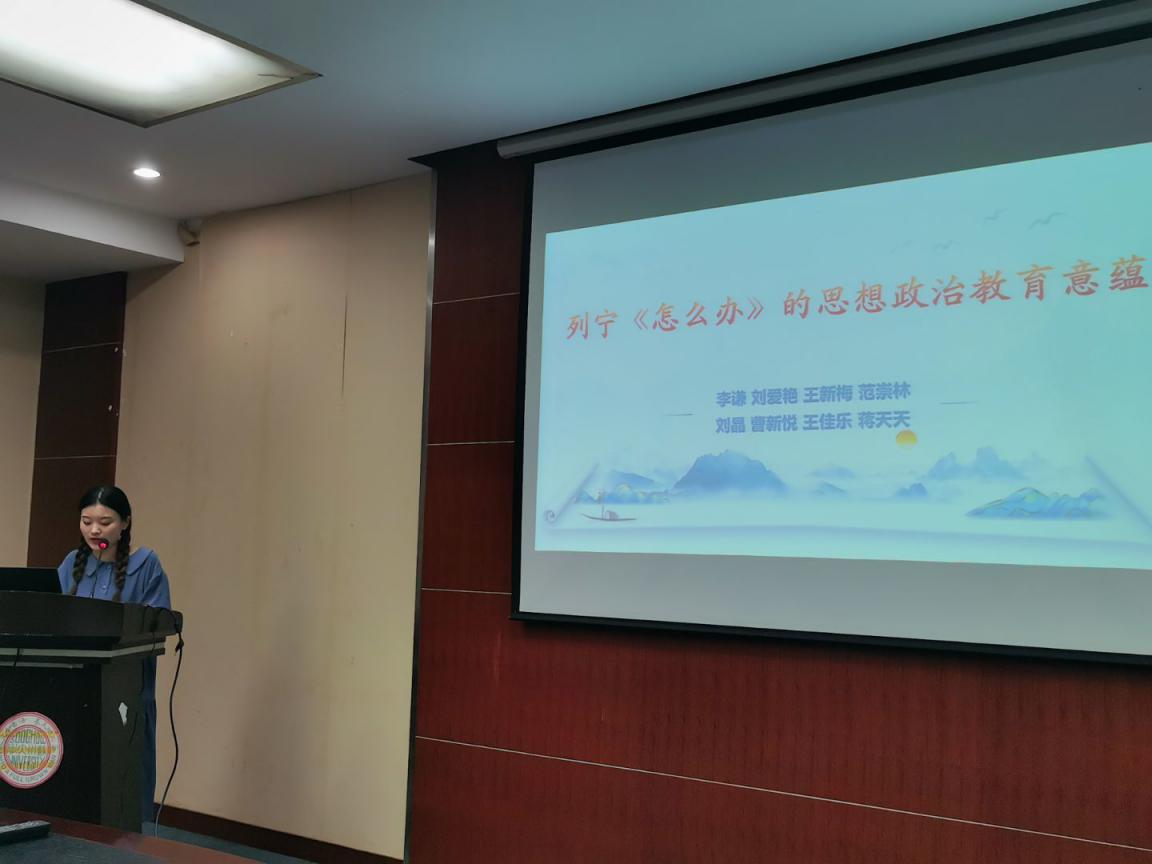 陈优同学进行了《论列宁的青年教育思想及其现实启示——重温<青年团的任务>》为主题的读书分享,从时代背景、基本内涵、现实启示三方面进行介绍,同时,她也提出,我们在进行思想政治教育时,要重视榜样作用,树立终身学习理念、重视社会实践、为共产主义奋斗终身。