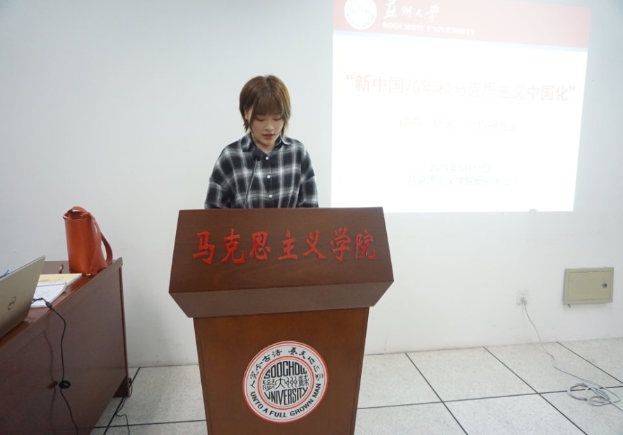 报告会伊始,陆倩倩代表91自拍 师生对山西财经大学91自拍 王素萍副教授表示了热烈的欢迎。本期“读书·研究·写作”报告会以“新中国成立七十周年”及“马克思主义中国化”为主题,报告人分别就近期学习体会进行阐述。本次共有来自91自拍 的七名硕博研究生进行分享,他们分别是18级博士生于佳、17级硕士生王红怡、章咏芳以及18级硕士生吉星、黄烨栋、沈亚波和许芷琳。