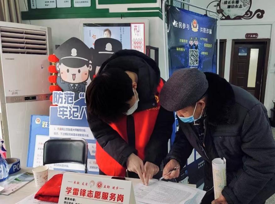 图为陈磊同学为社区老人宣传反诈骗套路